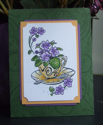 Stamps: Violet Tea Cup (Biblical Impressions) Background Swirl (Inkadinkado), Birthday Wishes (SU)